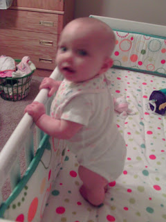 She is now 8 month old and doing so much. Sitting up all the time now. She does great at pulling herself up to her knees and now she is pulling herself up to her feet, sometimes even letting go and standing alone for a few seconds. We had to lower her crib since she is standing now. She is crawling a few steps now, especially when trying to get into things she not allowed into, but she seems more focused on standing and walking.